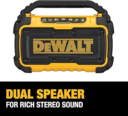 DEWALT 20V MAX Bluetooth Speaker, 100 ft Range, Durable for Jobsites, Phone Holder Included, Lasts 8-10 Hours with Single Charge (DCR010)